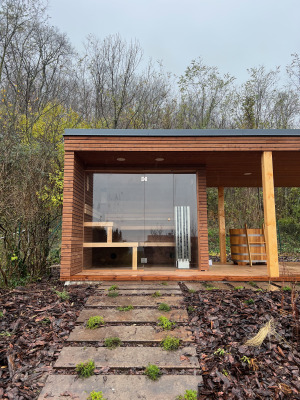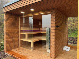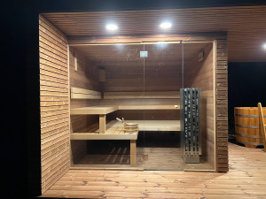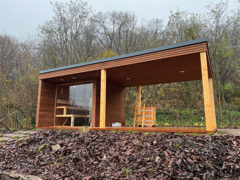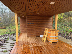 Exteriérová fínska sauna s ochladzovacou kaďou