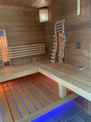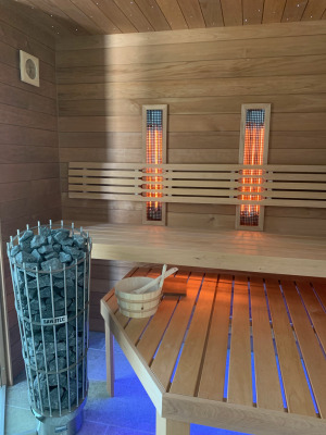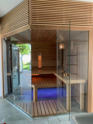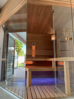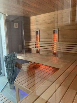 Prevedenie: Obklad thermowood osika, lavičky jelša Presklenie: Rožné